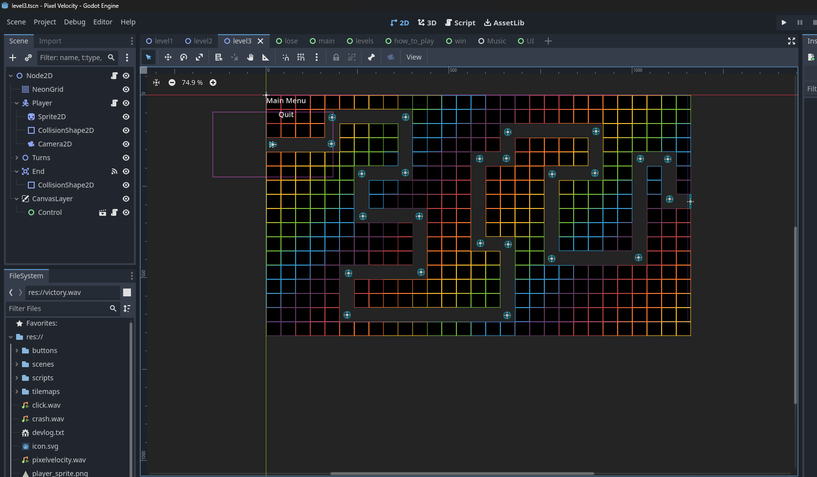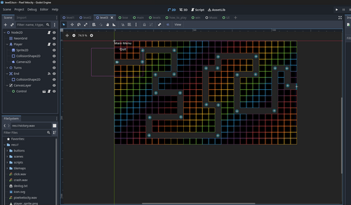 - Finished main menu scene with a cool tilemap background, a title label, and 3 buttons: Start, Levels, and Quit.